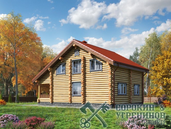 Проект двухэтажного дома площадью 180м2, из бревна диаметром 280мм. Размер сруба 910х12 метров. Первый этаж имеет террасу, лестничный холл, гостиную, кухню, санузел и спальню. На втром этаже три спальные комнаты, холл, санузел, гардеробная, балкон. Дом построен в Северном Казахстане в городе Гараганда в 2012 году.